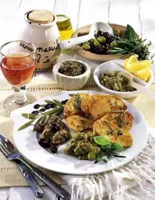 Prepare olive paste from black olives with the other ingredients in the same way. Arrange everything, garnish if necessary. Goes well with mixed salad