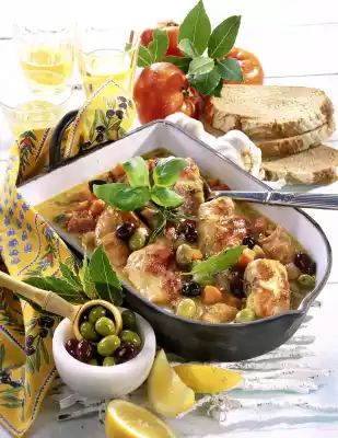Fry the onion and carrots briefly. Deglaze with vermouth and 3/4 l water. Bring to the boil. Stir in broth. Wash the herbs and bind into a bouquet. Add to meat with tomatoes. Braise open in the preheated oven (electric cooker: 200 °C/recirculating air: 175 °C/gas: level 3) for approx. 45 minutes. Add olives and cook for 15 minutes