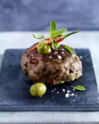 Soak the rolls in cold water for about 10 minutes. In the meantime peel and finely dice the onion. Squeeze the bread roll well and knead with onion, minced meat, egg, oregano, chilli, olives and garlic. Season with approx. 1 level tsp salt and approx. 1⁄2 tsp pepper.