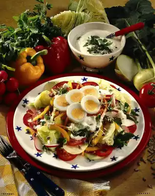Hard boil the eggs for about 10 minutes, rinse with cold water and peel. In the meantime peel and wash kohlrabi and carrots. Wash, clean and slice the tomatoes. Clean and wash the rest of the vegetables, cut radishes into wedges, carrots and peppers into sticks, kohlrabi and iceberg lettuce into pieces. Mix the vegetables carefully and arrange on plates. Wash and chop the herbs.