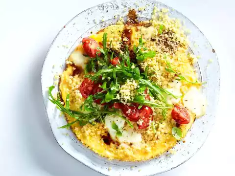 Meanwhile wash and quarter the tomatoes. Clean, wash and shake dry the arugula. Pluck the mozzarella into pieces. Loosen millet with a fork if necessary. Whisk eggs and season with salt. Bake 2 omelettes one after the other, but heat 1 teaspoon of oil in a small coated pan (22 cm Ø). Add half the egg mixture. Spread about 2 tablespoons of cooked millet and half of mozzarella on top. Cover and let it simmer at medium heat for about 4 minutes. Keep the finished omelette warm in a hot oven (electric cooker: 100 °C/circulating air: 80 °C/gas: see manufacturer) and bake the 2nd omelette in the same way.