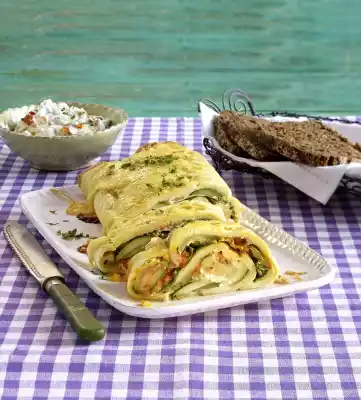 Take the omelette out of the oven and let it cool down a little. Cover with crème fraîche, rocket, zucchini and half the cheese. Roll the omelette tightly from the long side and sprinkle with the rest of the cheese. Place on a baking tray lined with baking paper and bake in a hot oven for about 20 minutes. Arrange the finished roulade while still warm. Sprinkle with the remaining parsley. Serve with bread and a herb curd