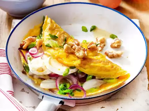 1⁄2 Heat a teaspoon of oil in a frying pan. 1⁄4 Cover the egg cream and let it set for about 5 minutes over a low heat. Remove. 1⁄4 Spread the onion mixture and 2 slices of goat's cheese on one half of an omelette, fold over and keep warm.