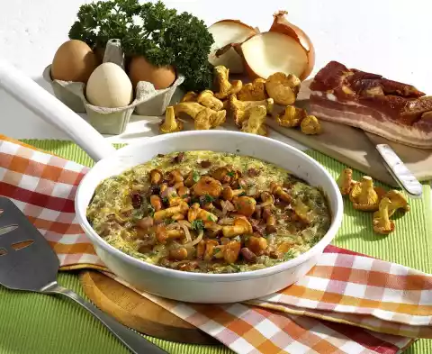 Stir in the parsley, except for something to garnish. Fry bacon in a pan, add onions and fry briefly. Add chanterelles and fry for about 3 minutes. Pour egg milk over it and let it simmer for about 10 minutes covered at low heat.