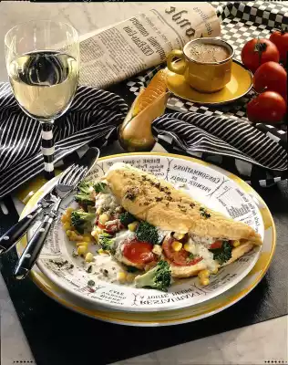 Deglaze with broth and bring to the boil. Mix the sour cream and the remaining starch and thicken the stock with it. Bring to the boil again and season to taste with pepper. Add broccoli, corn and tomato to the sauce and warm it up.