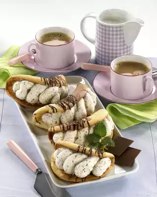 Mark 4 circles (approx. 11 cm Ø) on it. Spread the sponge mixture evenly on the circles. Bake in a preheated oven (electric cooker: 200 °C/ convection oven: not suitable/ gas: level 3) for 7-10 minutes until golden brown. Remove from baking paper immediately, carefully fold over and let cool off. Grate 50 g chocolate for the filling. Whip the cream until stiff. Sprinkle vanillin sugar and cream setting agent into the mixture. Fold in the chocolate. Pour into a piping bag with a large perforated spout and squirt into the omelettes. Keep cold until serving. To decorate, chop the remaining chocolate and melt in a hot water bath.
