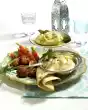 Clean and wash the spring onion and cut it into pieces about 5 cm wide. Cut pieces lengthwise into thin strips. Wash and clean the mangetouts and cut them diagonally into thin strips. Cut bacon slices into large pieces. Wash chervil, shake dry, pluck leaves from the stalks. Take the galette out of the oven and let it cool down briefly. Sprinkle with mangetouts, spring onion, bacon and chervil.