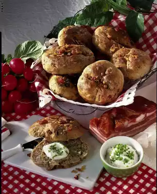 Shape it into 10 rolls and place them on a baking tray lined with baking paper. Score the rolls as you like with the back of a knife. Let the rolls rise again in a warm place for about 20 minutes. Then bake in the preheated oven (electric cooker: 200 °C/ convection oven: 175 °C/ gas: level 3) for approx. 20 minutes. Take the rolls out of the oven and let them cool down on a grid. Serve with chives quark