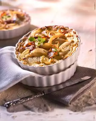 Season with salt and pepper. Let it cool down a little. Roll out the short pastry on a lightly floured work surface to a thickness of approx. 5 mm and cut out 4 circles (approx. 18 cm Ø). Grease four gratin dishes (approx. 15 cm Ø, 300 ml capacity) and line them with the pastry.
