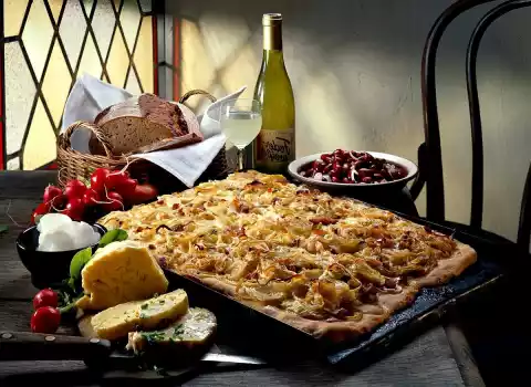 Dice the bacon and leave it out in a pan. Add fat and fry the onions in it. Season with salt, pepper and caraway seeds. Knead the yeast dough again, roll out on a greased baking tray and let it rise for 15 minutes.