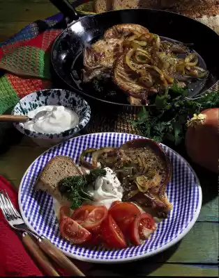 Mix vinegar, salt, pepper, sugar and chives. Beat the remaining oil into the mixture. Mix vinaigrette and tomatoes. Wash and chop the parsley. Arrange chops and onions sprinkled with parsley.