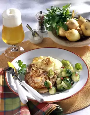 Stir once more before serving. Drain the Brussels sprouts and let them drain. Cut the bacon into small cubes and drain in the frying fat. Add butter and toss the sprouts in it. Arrange cutlet, onions, Brussels sprouts and mashed potatoes on a plate.