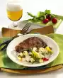 Add the onion to the cutlet shortly before the end of the cooking time and fry it. Pour 1 cup (approx. 150 ml) of boiling hot water into a bowl. Stir in 1/2 cup of puree flakes and let it swell for 1 minute.