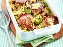 Heat 2 tablespoons of oil in a flat roasting pan. Fry the chops in it on each side for about 2 minutes. Mix the red onion strips, breadcrumbs, 2 tbsp. oil and parsley. Spread evenly over the chops and press down slightly.