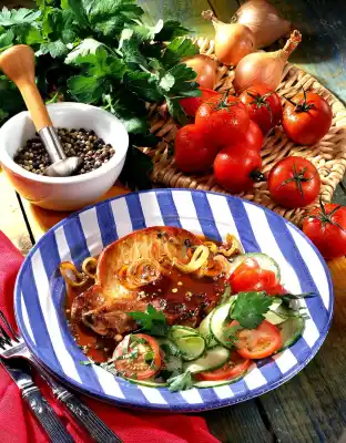 Wash the meat, dab dry and fry in hot fat while turning until golden brown. Season with salt and pepper. Remove the chop, onion and garlic and keep warm for a short time. Add 125 millilitres of vegetable stock to the stock.