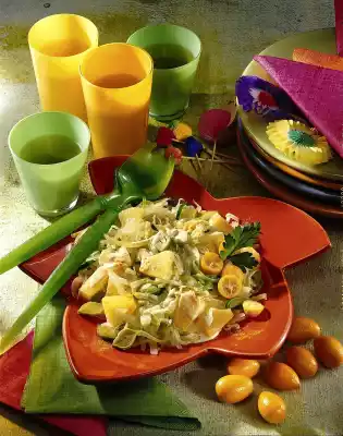 Drain the pineapple, collect the juice. Chop the pineapple. Mix yoghurt, mayonnaise and 3-4 tbsp. pineapple juice. Season with curry, sugar, salt and pepper
