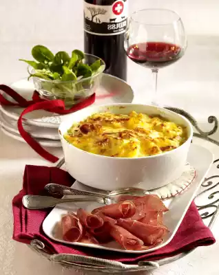 Then continue to simmer for about 5 minutes at low heat while stirring. Season sauce with salt, pepper and nutmeg to taste. Grease a high gratin or casserole dish. Cut the potatoes into slices and layer them in layers, alternating with the sauce.