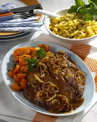 Take out the meat. Add some water to the stock if necessary, bring to the boil. Stir in the sauce thickener, continue to simmer for about 1 minute, season to taste. Arrange everything, garnish with parsley. Spaetzle go well with it