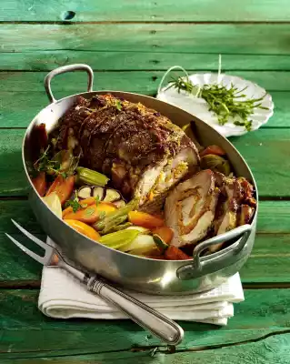 Roll up the roast from the cross side and tie up with kitchen string. Place in a flat roasting pan or on a greased fat pan and cook in a preheated oven (electric cooker: 175 °C/ convection oven: 150 °C/ gas: level 2) for approx. 2 hours