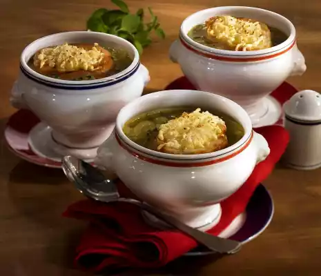 Pour soup into 4 ovenproof soup bowls. Put one slice of bread in each and sprinkle with cheese. Bake in the preheated oven (electric cooker: 200 °C/ convection oven: 175 °C/ gas: level 3) for 8-10 minutes.