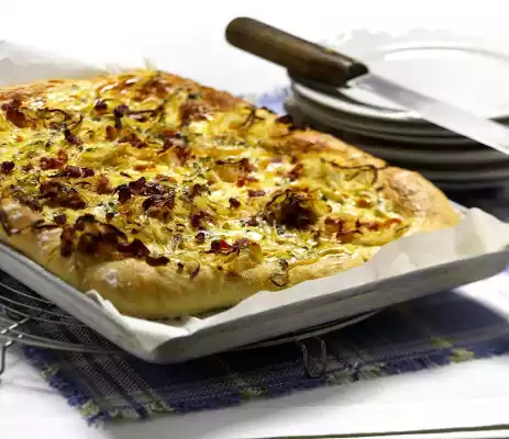 Mix eggs, sour cream and chives. Season with salt and pepper. Knead the dough once more, roll out on a floured work surface rectangularly in the size of the baking tray (approx. 40 x 25 cm). Line the baking tray with baking paper. Pour the dough on top. Spread the onion and bacon mixture over it and pour the egg sour cream over it. Bake in the preheated oven (electric cooker: 200 °C/ convection oven: 175 °C/ gas: level 3) for 25-30 minutes