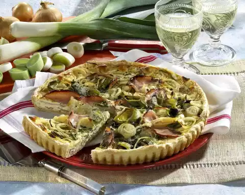 Peel onions and cut them into rings. Clean and wash the leek and cut it diagonally into rings. Sauté onions and leek in hot oil for a few minutes. Place the puff pastry slices next to each other on the floured work surface and let them thaw. Halve the slices of Kasseler.