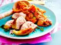 In the meantime cut the ham into wide strips. Take the tart out of the oven. Let it rest for a short time. Cover with ham and garnish with chervil and strips of spring onion as desired.