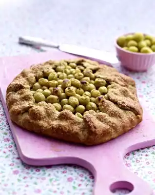 Stachelbeeren in die Mitte stapeln und dabei mit Streuzucker bestreuen. Die Ränder des Teigs über die Früchte falten, so dass eine offene Torte entsteht. Die Teigränder mit Eiweiß bepinseln und mit dem Demerara-Zucker bestreuen. Im vorgeheizten Backofen bei 200ºC/Gas Stufe 6 35 bis 40 Minuten backen, bis der Teig knusprig und goldgelb ist.