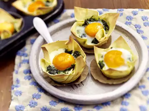 Roll out the pasta dough and cut into 12 squares (each approx. 14 x 14 cm). Use the remaining dough for other purposes. Grease the hollows of a muffin tray (12 hollows) with oil. Place the noodle dough squares in the troughs and spread the spinach mixture in the troughs. Put 1 egg in each of the troughs