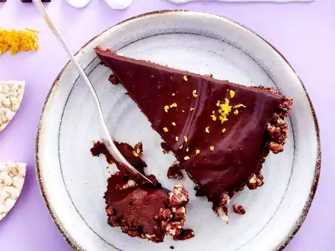 Spread the chocolate-orange cream on the rice cake base and smooth it down. Chill the tart for about 4 hours. Carefully lift it out of the tin and sprinkle with the remaining orange peel.