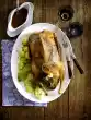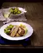 Finely chop 1 onion. Cut open the vanilla pod and scrape out the pulp. Melt the fat in a pot and fry the onion, vanilla pulp and pod until transparent. Add cabbage and 200 ml chicken stock, boil up while stirring. Peel the apple and grate the flesh until the core. Stir the apple into the cabbage, cover and simmer for about 15 minutes, stirring occasionally. Stir in jam, season with salt, pepper and possibly some sugar. Keep warm in a closed pot