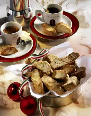 Place rolls at a distance on a baking tray lined with baking paper and bake in a preheated oven (electric range: 200 °C/ gas: level 3) for 10-15 minutes. Take out and let cool down. Cut the rolls diagonally into approx. 1 cm thick slices. Place biscotti with a cut surface on the baking tray and bake in the preheated oven (electric range: 200 °C/ gas: level 3) for 8-10 minutes