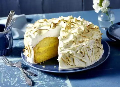 Beat the egg whites with the whisk of the hand mixer until stiff, adding 200 g sugar. Remove the cake from the cake ring and spread with the beaten egg white, making slight waves with a spoon.