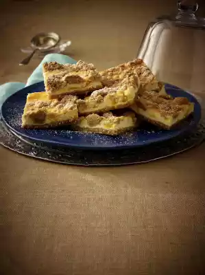 Pour on the curd mixture and smooth it down, spread the remaining crumbles on top. Bake in the preheated oven (electric cooker: 175 °C/ convection oven: 150 °C/ gas: level 2) for approx. 1 hour. Take out and let cool down. Tastes best when left to rest overnight. Cut the cake into pieces and remove from the fat pan and dust with icing sugar as desired