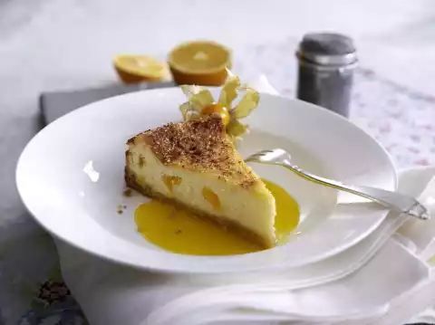 Shortly before serving, sprinkle the cake with 3-4 tablespoons of brown sugar. Caramelise briefly with a kitchen gas burner or under the hot oven grill and allow to set again. Serve with the mango sauce.