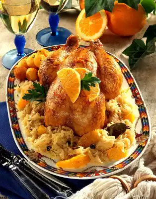 Peel 2 oranges, remove white skin. Cut the fillets from the parting skins, collect the juice. Squeeze the rest of the orange, mix juice and honey. Pour 2/3 of the juice and 100 ml water on the cabbage, continue to braise for about 45 minutes. Spread the rest of the juice on the chicken 15 minutes before the end of the cooking time. fold orange fillets into the cabbage, season and continue cooking