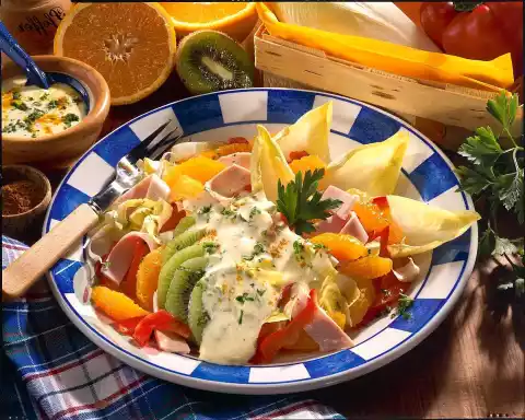 Mix the kiwi slices and turkey breast with the sauce. Arrange the chicory leaves on 4 plates and arrange the salad on top. Sprinkle with remaining parsley and serve garnished with kiwi and parsley.