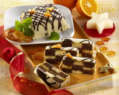 Cut each plate into a rectangle (27 x 12 cm). Cut each rectangle crosswise into strips about 3 cm wide. Knead the marzipan and icing sugar, cut in half and roll out into rectangles (approx. 24 x 18 cm) on a surface dusted with icing sugar. Warm up the jam. Spread the sponge cake strips with it and place 3 x 3 strips on top of each other like a chessboard. Coat the marzipan plates with jam as well, wrap the cake in it and carefully press the edges together. Chop the chocolate coating and melt it over a hot water bath. Pour into a freezer bag, cut off a small corner. Decorate the cake with chocolate coating. Cut oranges into small corners and place them on the cakes. Let dry