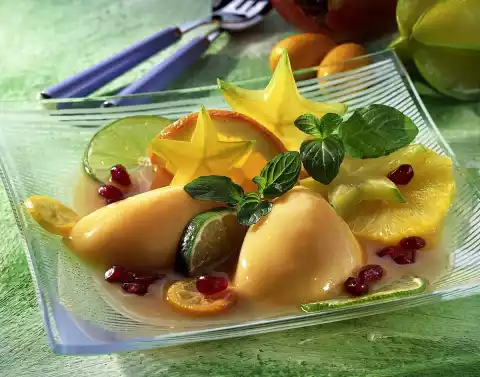 Cut the remaining fruit into slices. Serve dessert with fruit slices and decorated with mint.