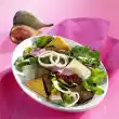 Mix juice, vinegar, salt, pepper and sugar. Whip the oil into the mixture. Peel onions and cut them into thin rings. Clean and wash lamb's lettuce