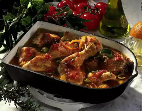 Add the rosemary branch, bay leaf, orange peel and tomatoes and braise in a closed pot for about 30 minutes. Little by little pour on the remaining chicken soup. Add the olives about 5 minutes before the end of the cooking time.