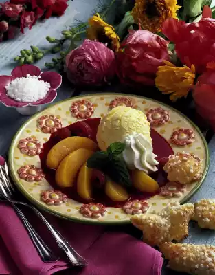 Cut the peach halves into slices. Arrange some sauce, peach slices and 1 scoop of ice cream on each plate. Decorate with cream tuff, mint leaves and raspberries. Add the puff pastry.