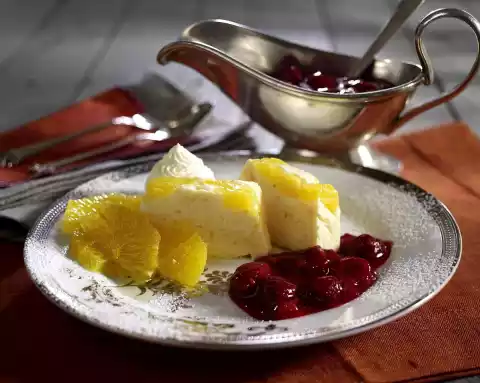 Boil half the berries, 1 tablespoon of sugar and 5-6 tablespoons of water. Mix starch and 1 tablespoon of water. Bind berries with it, simmer briefly. Mix in the rest of the berries. Cut parfait into slices. Serve with hot raspberries.