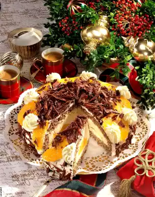 Peel off plenty of shavings from the chocolate coating with a peeler. Cut the remaining oranges into slices. Whip 350 g cream and 1 tablespoon sugar until stiff. Spread 2/3 of the cream all around the cake. Decorate with cream tuffs, orange slices and chocolate shavings. Put it in a cold place