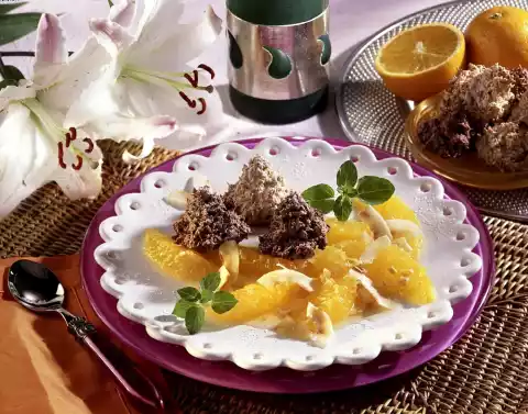 Mix orange juice, ginger and liqueur. Season to taste with 2 teaspoons of sugar. Let the oranges steep for about 15 minutes. Arrange orange salad with 2-3 macaroons each. Decorate with coconut chips and mint.