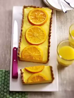 Cut the rest of the orange into slices. Bring 250 ml water and 30 g sugar to the boil and let the orange slices steep in it for about 10 minutes. Take them out, drain and let them cool down. Just before serving, cover the tart with candied orange slices