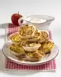 On a floured work surface, roll out the short pastry not too thin and cut out circles (approx. 14 cm Ø). Line a mould with them and cut off any excess dough. Prick the bottom of the pastry several times with a fork and place the tins on a grid.