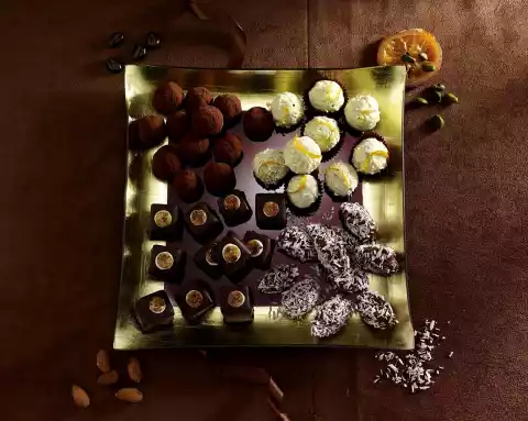 Using a round praline fork, dip balls one by one into the chocolate coating. Drain on a grid and let dry. Remove the balls from the grid and dip them into the chocolate coating again, then place them back on the grid. When the couverture begins to solidify, roll the balls with a fork over the grid so that peaks form. Allow to dry. Drain the orange zest. Decorate the chocolates with the zests. Store in a cool and dry place
