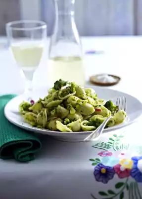 Knead the butter in pieces, sugar, flour, vanillin sugar and egg first with the dough hooks of the hand mixer, then with your hands to a smooth dough. Heat the dough in foil wic3 tbsp. olive oil in a very large pan, fry the garlic and chilli in it. Add broccoli and anchovies, steam for 1-2 minutes, season with salt and pepper. Remove 200 ml pasta water with a ladle. Deglaze broccoli with it, bring to the boil, add broccoli leaves and chill for about 30 minutes.