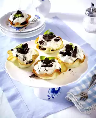 Shortly before serving, crumble the cookies. Spread about 2/3 of the biscuits on the rib cups. Spread the cream loosely and sprinkle with the remaining biscuit pieces. Decorate with mint.